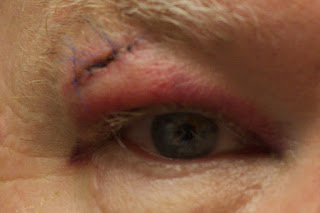 Eyebrow lacerations are typically simple and uncomplicated. It is not recommended to shave or trim the eyebrows.[2] Using 5-0 nonabsorbable suture, start by placing a few sutures to align the superior and inferior margins of the brow hair.[2] If necessary, next place a few deep sutures to approximate the superficial fascia.[2] Then finish the repair with a simple interrupted closure. Once again, no dressing is necessary. For all eyelid and eyebrow lacerations, patients are recommended to perform daily wound care by cleaning and applying antibiotic ointment. Suture removal is generally scheduled in three to five days.[1,2]